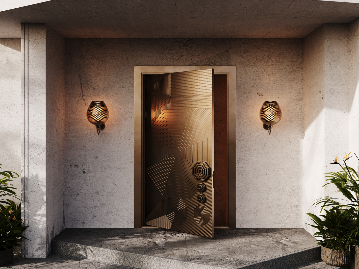 Design References | This door inspired by the form of a bagua mirror symbolises the energy of fire. The door takes its form in the self-patterned metal skin with the handle in the semi-precious inlay. Enchanting on its own with a self-patterned metal skin, it showcases a blend of environmental notions. |