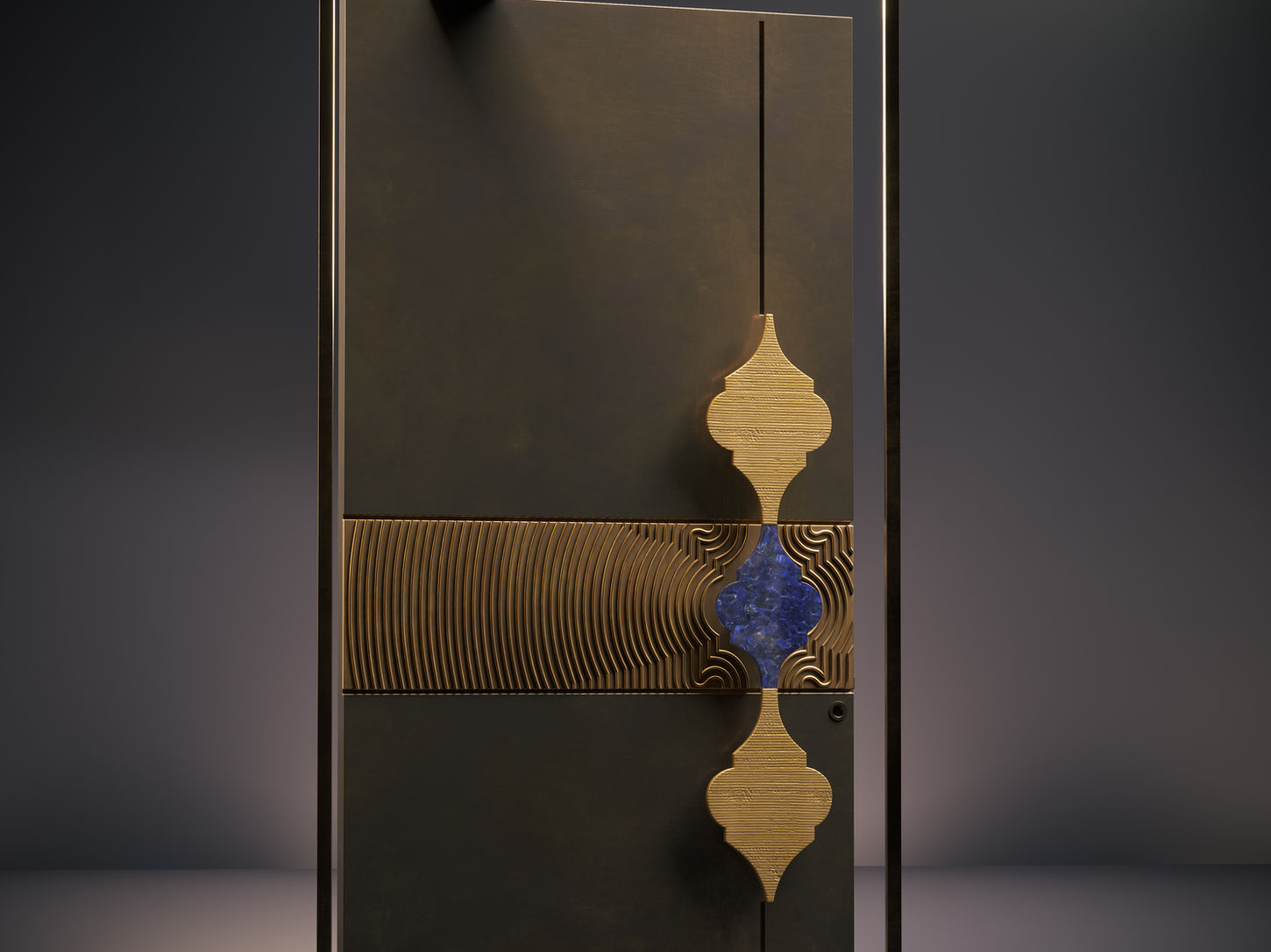 Design References | The door represents the abstract version of the Damask motif. the floral pattern forming the contouring in an embossed fashion. The floral handle further jewels the door design. Harmonising opulence and practicality, the Damask Door transcends the confinements of utilitarian principles. |