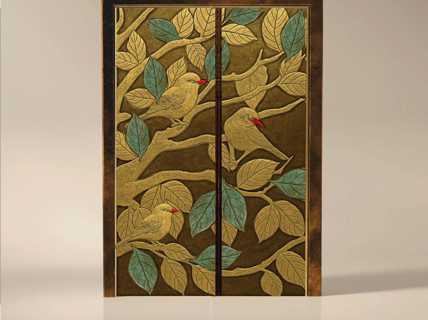 A nuanced brass patina settles into the leaves, introducing tonal depth and a softly aged character. Gentle gleams move across the surface, revealing sculptural relief and quiet dimensionality. The birds take shape in brass - precise yet organic - while restrained enamel accents warm select details, enhancing tactility without disturbing the panel’s composure.