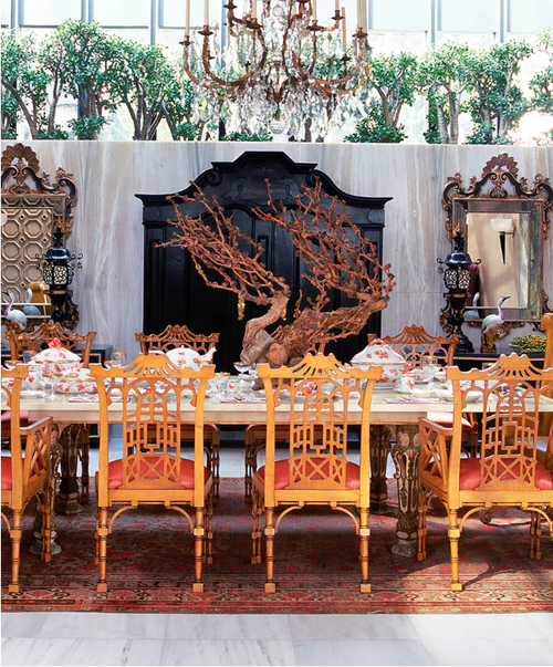 To create a rich, well-traveled look, Moorish chairs, antique Khotan rugs, hand-painted wall coverings, and millwork in dry brush finishes and hand-carved cabinetry were used. The color scheme included shades of eggplant, vermillion and papaya with touches of brass to play off the outdoor greenery that was visible from the home's plentiful floor-to-ceiling windows.