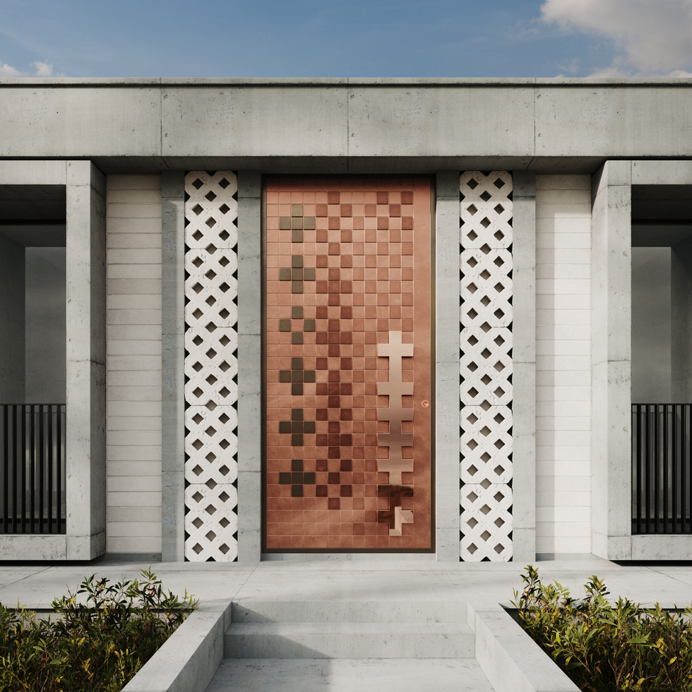 Featuring an intricate arrangement of checkered boxes on its facade, the designs of the Copper Cascade Door reflect modern geometric art and classic handiwork.