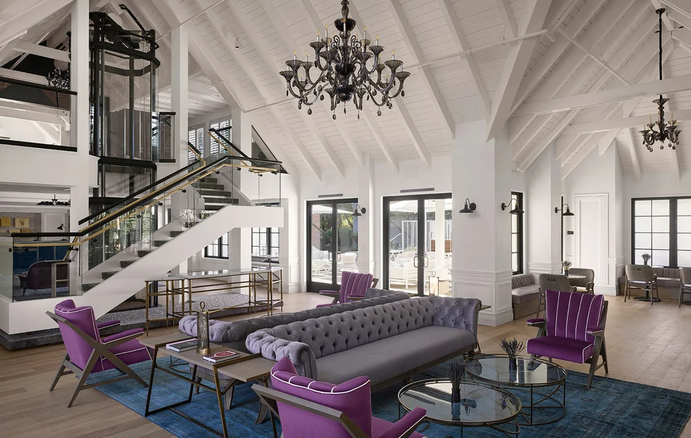 The breathtaking main house lobby brings rustic elegance and modern sophistication to new heights of contemporary style, enabling guests to lose themselves in the moment, enjoying Napa’s peaceful appeal. The celebratory, showcase quality of the staircase was intentional, bringing a bit of dramatic effect into the space.