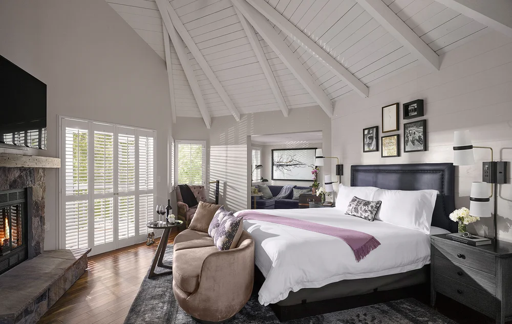 Guest rooms are light, fresh and welcoming with the beds and wood-burning fireplaces as the focal points of the room. A white clapboard headboard wall and rich velvet seating provide unique textural elements.