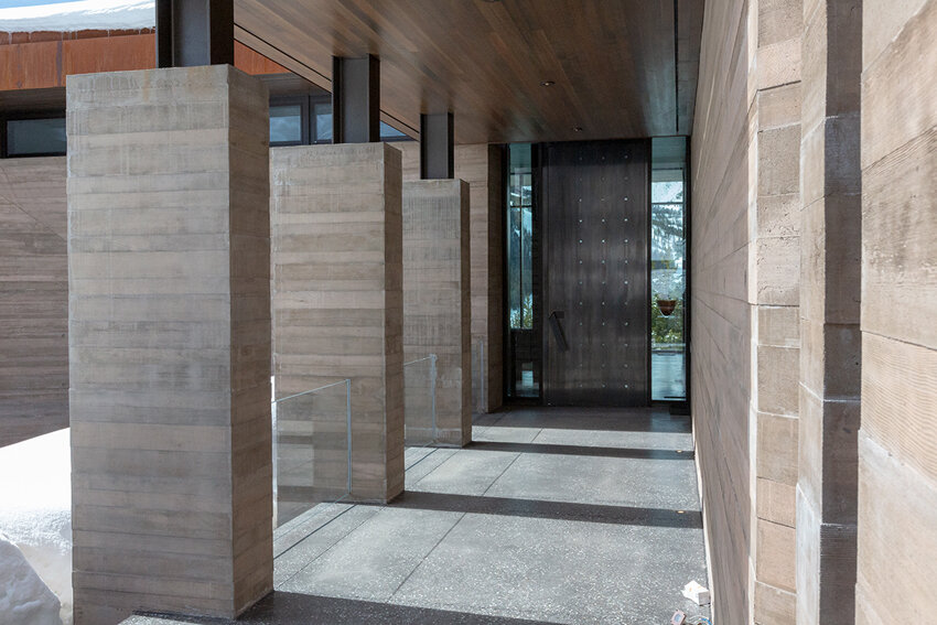 Crafted with copper, this exquisite metal door features a dark Patina finish. Furthermore, it showcases a solid curvilinear bronze bar door pull that elevates the extravagant feel of entrances.