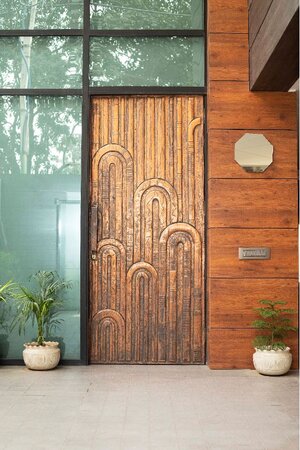 It’s no secret that the right piece of front door design can transform a house . This beautiful entrance features DINE from a handcrafted copper door collective of a luxury design brand called Aluminr. Purely handcrafted in copper , this piece, has been an infinite source of inspiration since its creation , and recreated in various forms. Offering a stunning blend of classic and modern design, bridging the gap between art and architecture ,and creating a boast and dainty experience .