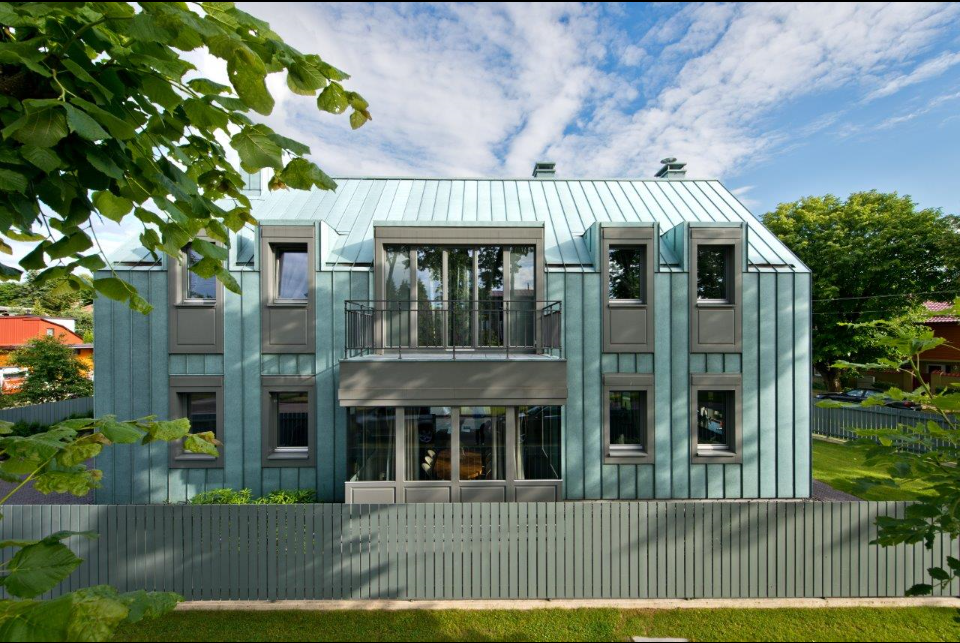 To meet both technical and architectural expression requirements, we determined that the main facade, pitched roof and other elements should be covered with copper. The green pre-patinated copper surface complements grey coloured boarding, window frames and other elements, providing a restrained palette of cool, contemporary colours.