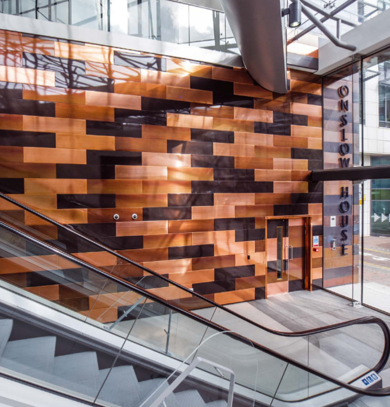 The internal copper cladding had a post-lacquer finish applied to arrest further oxidisation, so retaining the three colours and protecting the surface. This creates a reflective surface, mirroring and enhancing the lightness of the atrium space.