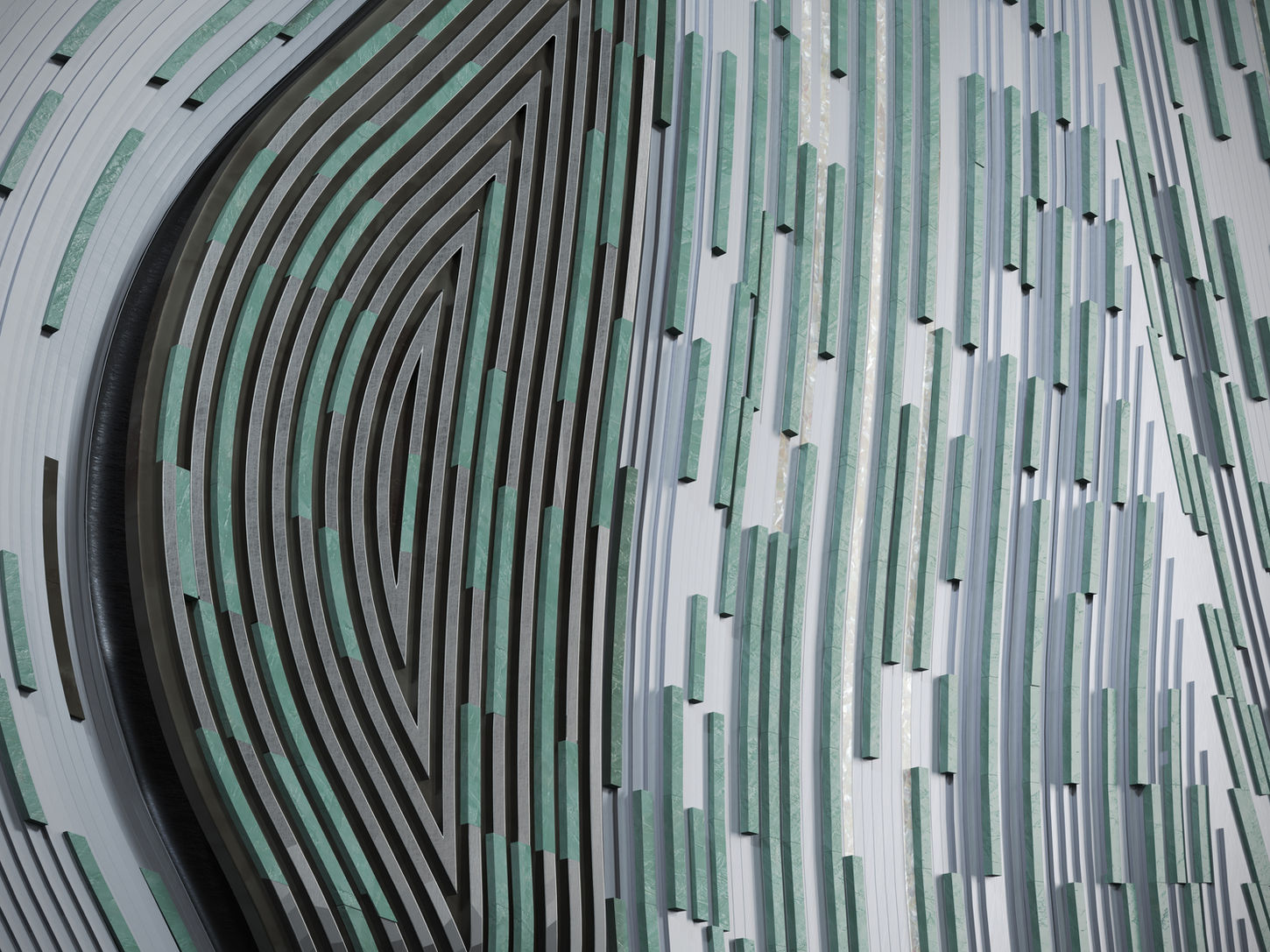 The Whirl of Grace Door captures the hypnotic rhythm of nature’s swirling motions, where wind currents and flowing waters converge in sculptural form. Gunmetal and stainless steel surfaces, shaped through controlled erosion and oxidation, ripple with movement. Inlays of Green Aventurine and White Mother of Pearl lend luminosity and calm, creating a bold, fluid composition that speaks of grace in motion and elemental power.